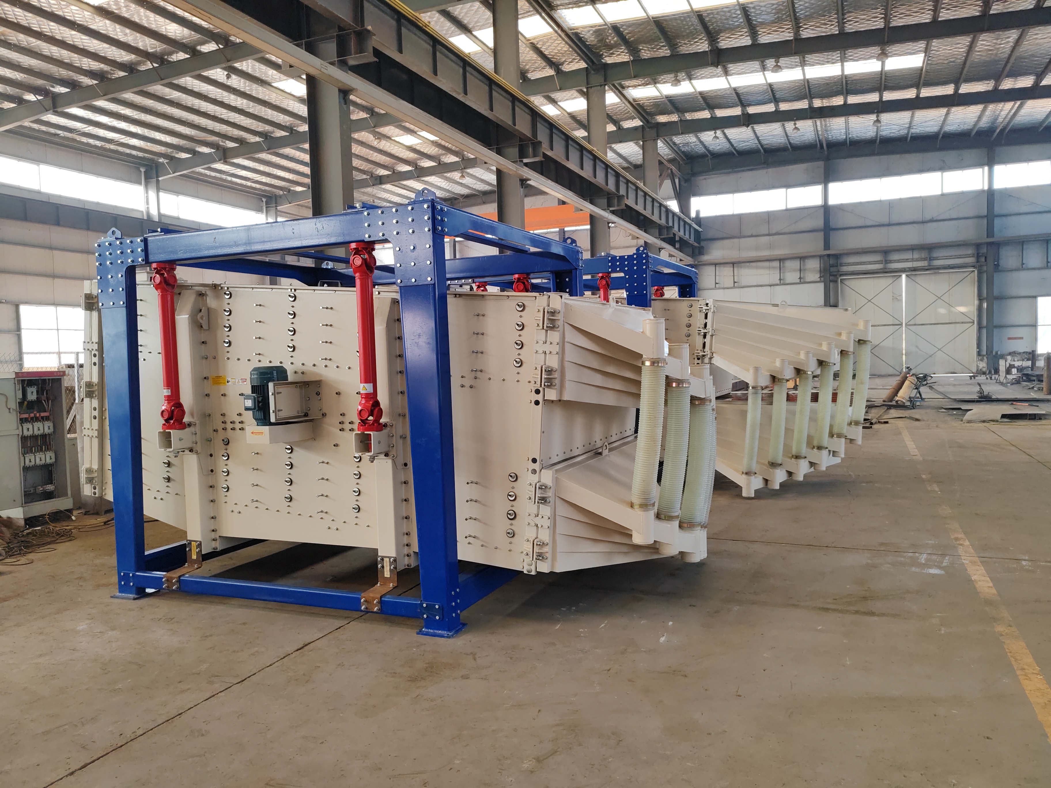 直線篩(直線振動(dòng)篩)利用振動(dòng)電機(jī)激振作為振動(dòng)源,使物料在篩網(wǎng)上被拋起,同時(shí)向前作直線運(yùn)動(dòng),物料從給料機(jī)均勻地進(jìn)入篩分機(jī)的進(jìn)料口,通過多層篩網(wǎng)產(chǎn)生數(shù)種規(guī)格的篩上物、篩下物、分別從各自的出口排出。具有耗能低、產(chǎn)量高、結(jié)構(gòu)簡(jiǎn)單、易維修、全封閉結(jié)構(gòu),無粉塵溢散,自動(dòng)排料,更適合于流水線作業(yè)。
